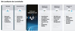 Der Clou des Curriculum 4.0: Festo Didactic passt die Lerninhalte in der so genannten Landkarte kontinuierlich an die aktuellen und relevanten Themengebiete der Industrie 4.0 sowie an die so genannten Berufsbilder und Kompetenzen von Berufen, wie beispielsweise die des Mechatronikers, an. Die Landkarte mit den Industrie 4.0-Themen besteht aus fünf Säulen – von den Grundlagen bis hin zum Expertenwissen.